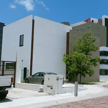 Cuenta con cocina integral con barra, sala-comedor abiertos, recámara o estudio con baño completo, jardín trasero, pasillos laterales y garage para tres autos. En la planta alta tiene tres recámaras con baño propio, la principal con vestidor.