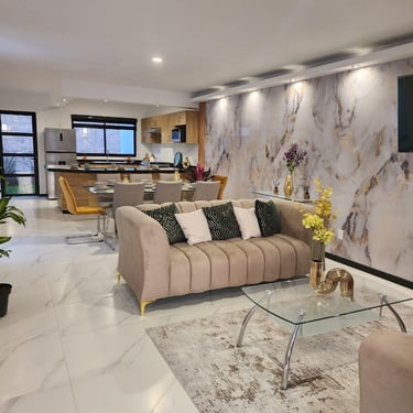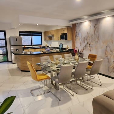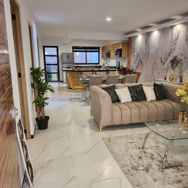 Primer nivel: Sala Comedor , Cocina integral con barra amplia, Estudio o recámara, Baño de visitas, Patio de lavado techado